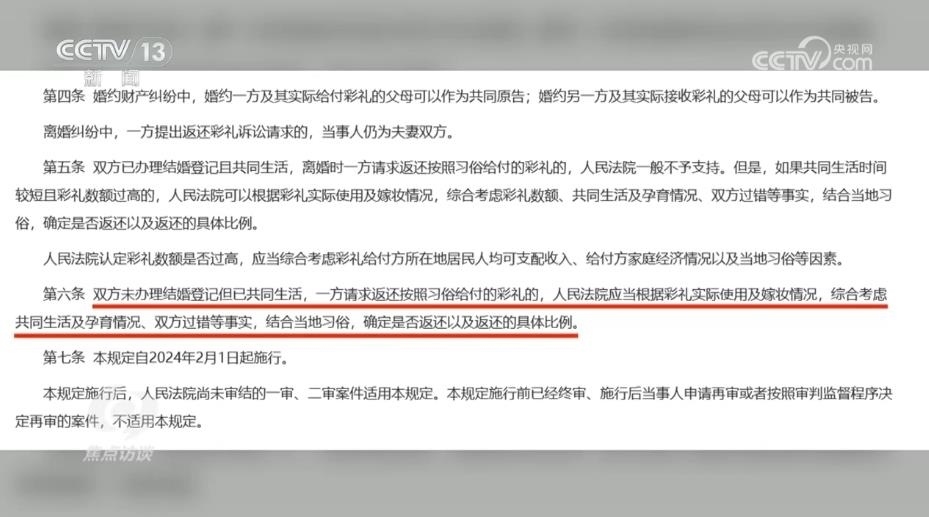 陜西省韓城市人民法院芝陽人民法庭庭長王春妮:“我們跟原告充分釋法明理,讓他知道咱們國家有新的規(guī)定,對他經(jīng)過反復(fù)做工作,他也降低了自己的心理預(yù)期。被告這邊認為我跟你在一起共同生活了,我也是實心想跟你過日子,但是因為沒有領(lǐng)證,而且我還跟你共同生育了一個孩子,你現(xiàn)在要求我給你返還彩禮,我就不愿意返還,心里有抵抗情緒?!?/p>