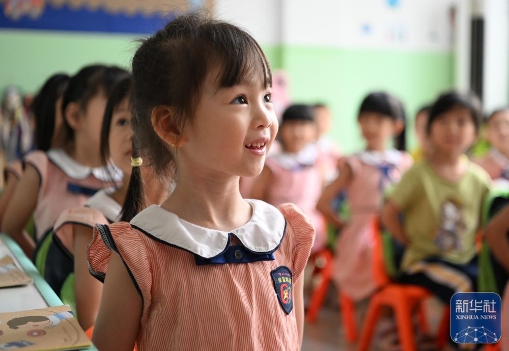 5月29日,在汕頭市貴嶼鎮(zhèn)北林保嬰幼兒園,莊恩琪(右)和同學(xué)在課堂上。