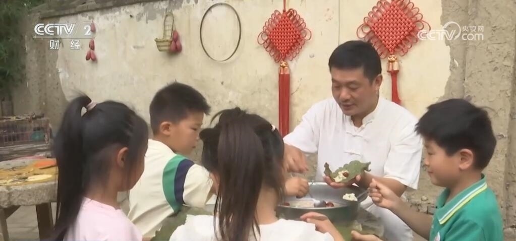 在河南南陽黃臺崗鎮(zhèn)一處農(nóng)家小院里,孩子們正圍坐在圓桌旁,跟大人們一起學(xué)著制槲包。和其他地方用葦葉不同,這里的粽子用的是當(dāng)?shù)靥赜械拈螛涞娜~子,不僅防腐,而且味道清香,相較于傳統(tǒng)的錐型粽,槲包呈長方形,吃起來也別有風(fēng)味。