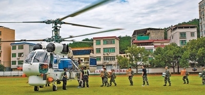 6月17日,廣東省梅州市平遠(yuǎn)縣體育場(chǎng),直升機(jī)在運(yùn)送救援物資。馮錫權(quán)攝(人民視覺(jué))