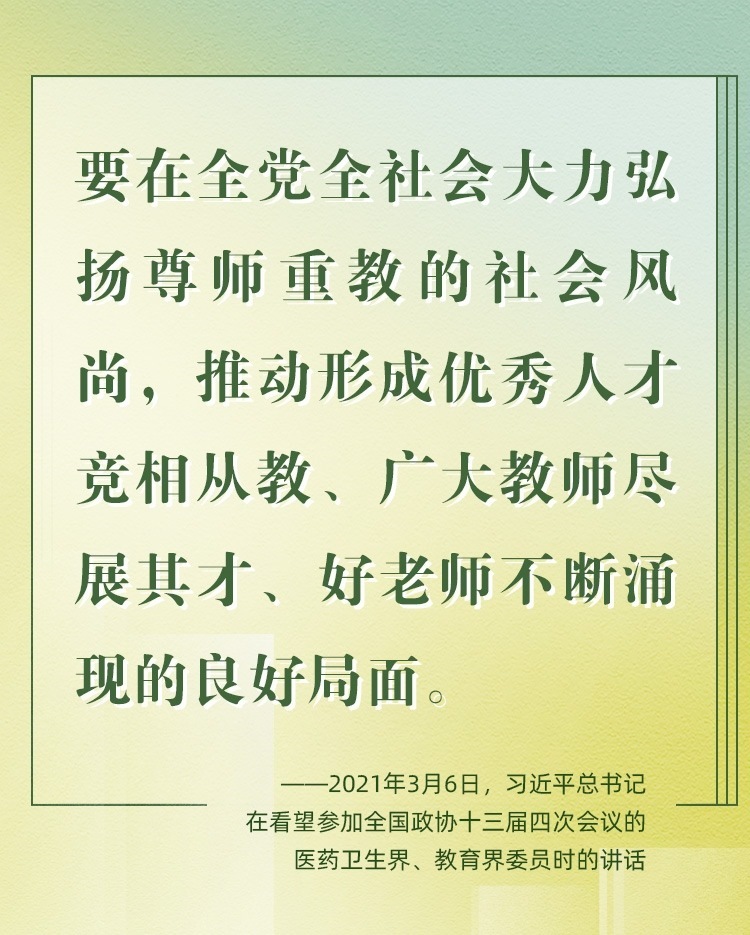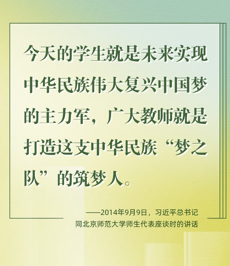 教師是立教之本、興教之源。2024年9月10日,是我國第40個教師節(jié)。黨的十八大以來,習(xí)近平總書記始終高度重視教師隊(duì)伍建設(shè),立足實(shí)現(xiàn)中華民族偉大復(fù)興中國夢、打造中華民族“夢之隊(duì)”筑夢人的特殊歷史使命,對教師相繼提出了“四有好老師”“四個引路人”“四個相統(tǒng)一”“大先生”等殷切期望和明確要求。