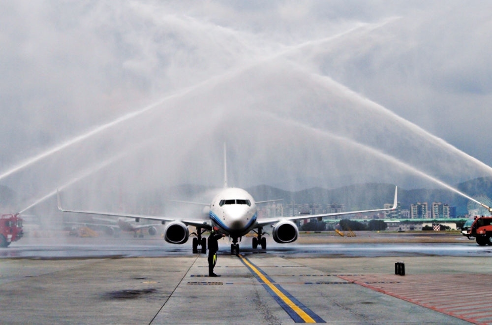 2008年,兩岸“三通”啟動(dòng)常態(tài)包機(jī),廈航成為廈門、福州和杭州航點(diǎn)的運(yùn)營航空公司。這是2008年12月15日,臺北松山機(jī)場以“水門”儀式迎接廈航常態(tài)化包機(jī)。