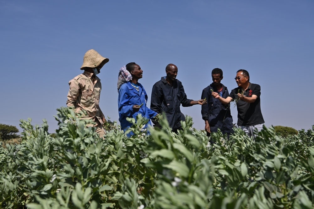 2023年9月27日,在位于厄立特里亞阿斯馬拉的農(nóng)業(yè)技術(shù)援助項(xiàng)目示范地,中國(guó)援厄第三期高級(jí)農(nóng)業(yè)專家組豆類(lèi)作物專家劉運(yùn)民(右一)與當(dāng)?shù)剞r(nóng)戶交流。為推動(dòng)厄立特里亞農(nóng)業(yè)產(chǎn)業(yè)發(fā)展,中國(guó)農(nóng)業(yè)農(nóng)村部已派出多批專家在厄立特里亞開(kāi)展涉及豆類(lèi)作物、果樹(shù)園藝、油料等領(lǐng)域的技術(shù)援助工作。