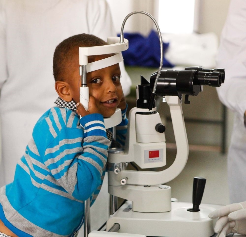 2014年5月2日,在埃塞俄比亞首都亞的斯亞貝巴的阿勒特醫(yī)院,一名小朋友等待參加“光明行”活動(dòng)的中國(guó)眼科專(zhuān)家為他看診。