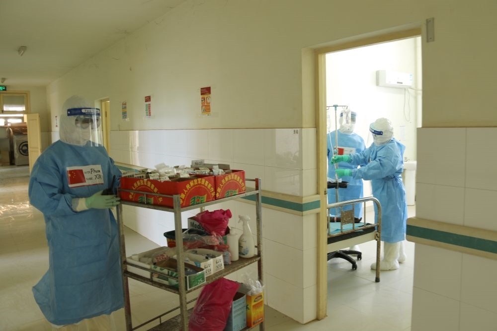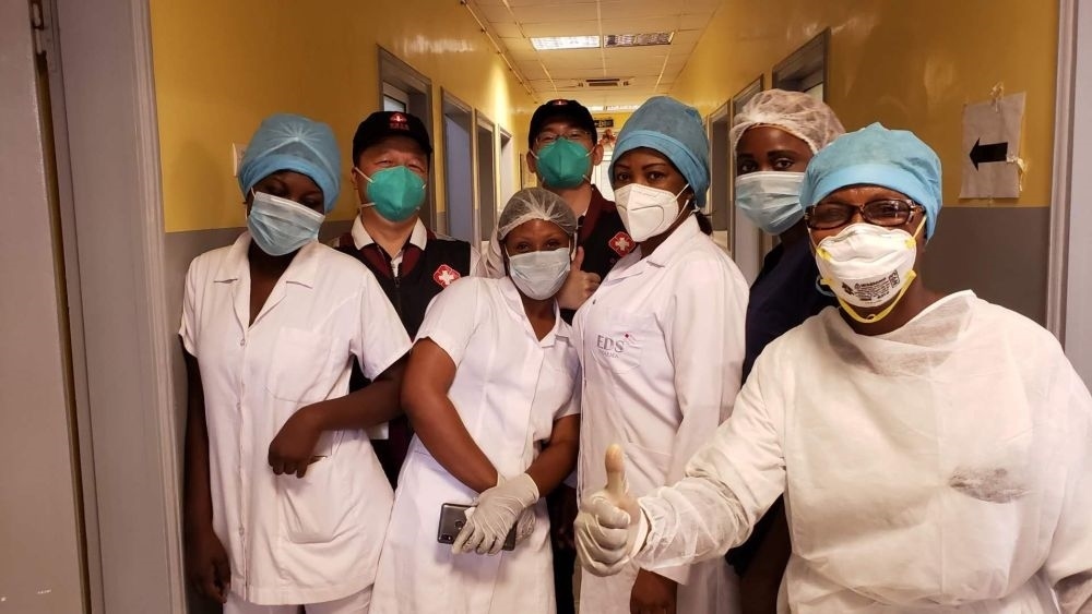 2020年5月26日,在剛果(布)首都布拉柴維爾,中國(guó)抗疫醫(yī)療專(zhuān)家組與當(dāng)?shù)匾痪€醫(yī)務(wù)人員交流,指導(dǎo)新冠肺炎病房建設(shè)。