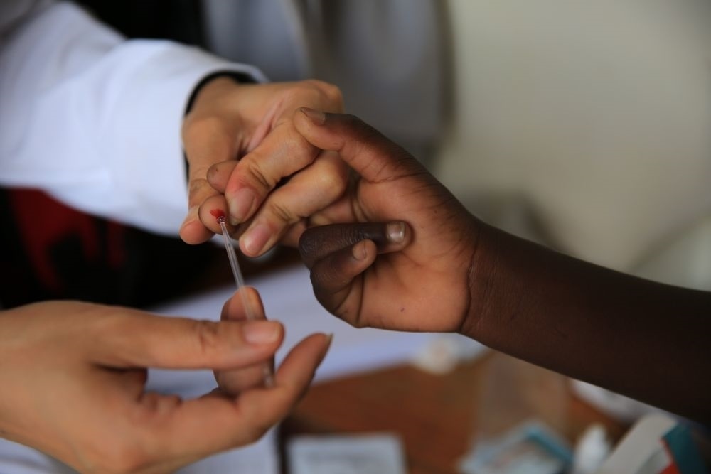 2018年12月8日,在馬拉維南部布蘭太爾市卡迪迪村衛(wèi)生院,第六批中國(guó)援馬拉維醫(yī)療隊(duì)醫(yī)生在義診活動(dòng)中為當(dāng)?shù)鼐用駲z測(cè)瘧疾。