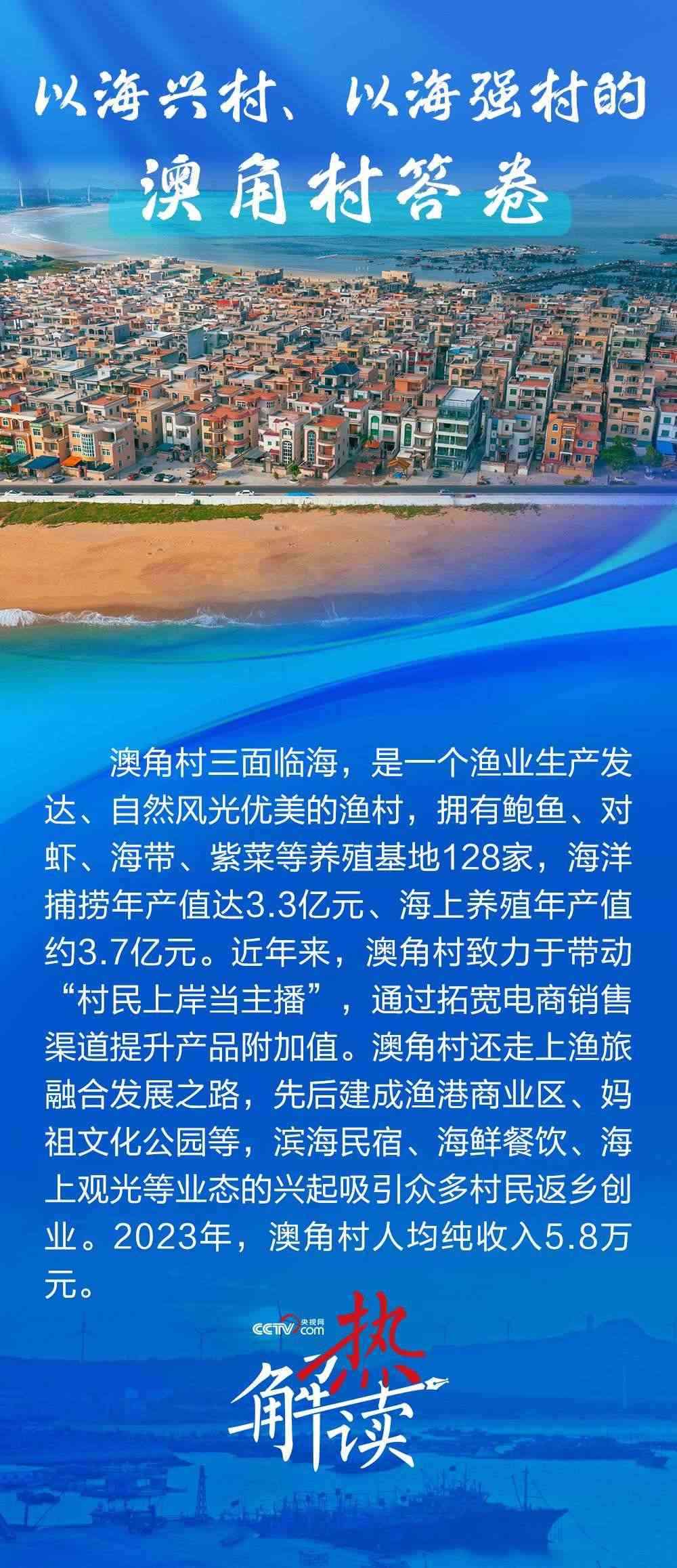 澳角村三面臨海,近年來走出了一條以海興村、以海強村的新路子??吹洁l(xiāng)村發(fā)生了巨變,總書記直言“鄉(xiāng)村振興還是要發(fā)揚優(yōu)勢”,并勉勵澳角村做好“?!钡奈恼拢卩l(xiāng)村振興、共同富裕的道路上一往無前。