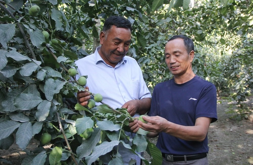 2023年8月29日,在新疆溫宿縣柯柯牙鎮(zhèn),果農(nóng)趙武中(右)、木合旦·吐?tīng)柕显谒麄兘?jīng)營(yíng)的核桃園里查看核桃生長(zhǎng)情況。新華社記者 李響攝