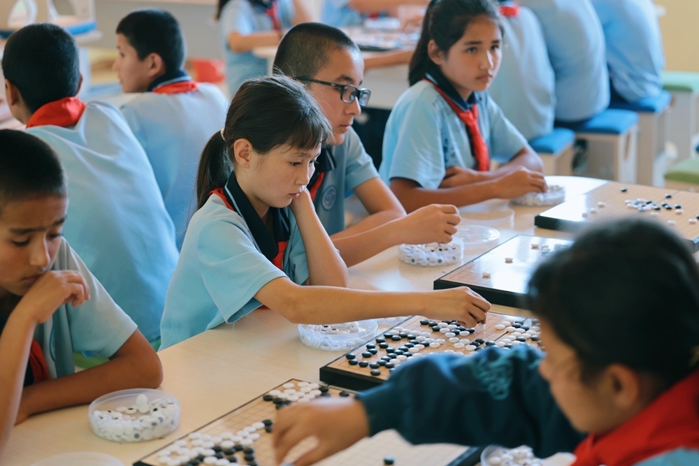 2024年9月23日,在新疆烏什縣依麻木鎮(zhèn)國(guó)家通用語(yǔ)言學(xué)校,學(xué)生們?cè)谙聡?。新華社記者 任沁沁 攝