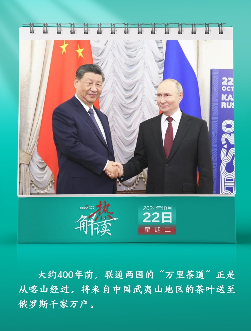 10月22日,習(xí)近平主席在俄羅斯喀山克里姆林宮同普京總統(tǒng)舉行年內(nèi)第三次會(huì)晤。在會(huì)談中,習(xí)主席提到一條名為“萬里茶道”的古老商道。