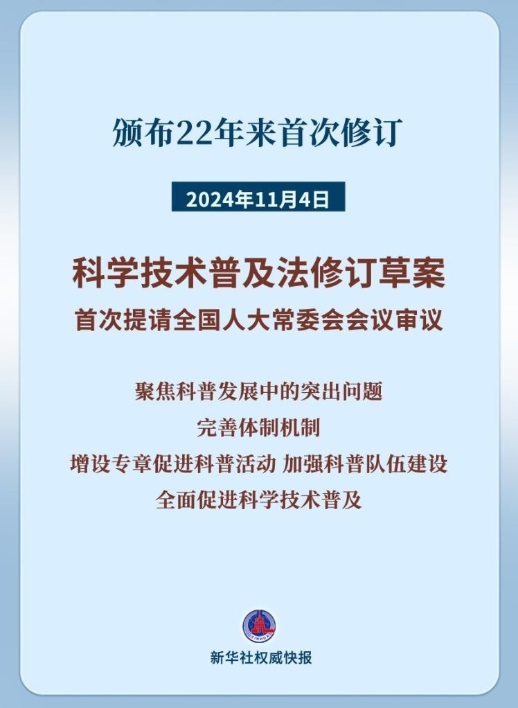 科學(xué)技術(shù)普及是實(shí)現(xiàn)創(chuàng)新發(fā)展的重要基礎(chǔ)性工作。11月4日,科學(xué)技術(shù)普及法修訂草案首次提請(qǐng)全國(guó)人大常委會(huì)會(huì)議審議,這是科學(xué)技術(shù)普及法自2002年公布施行以來首次修訂。