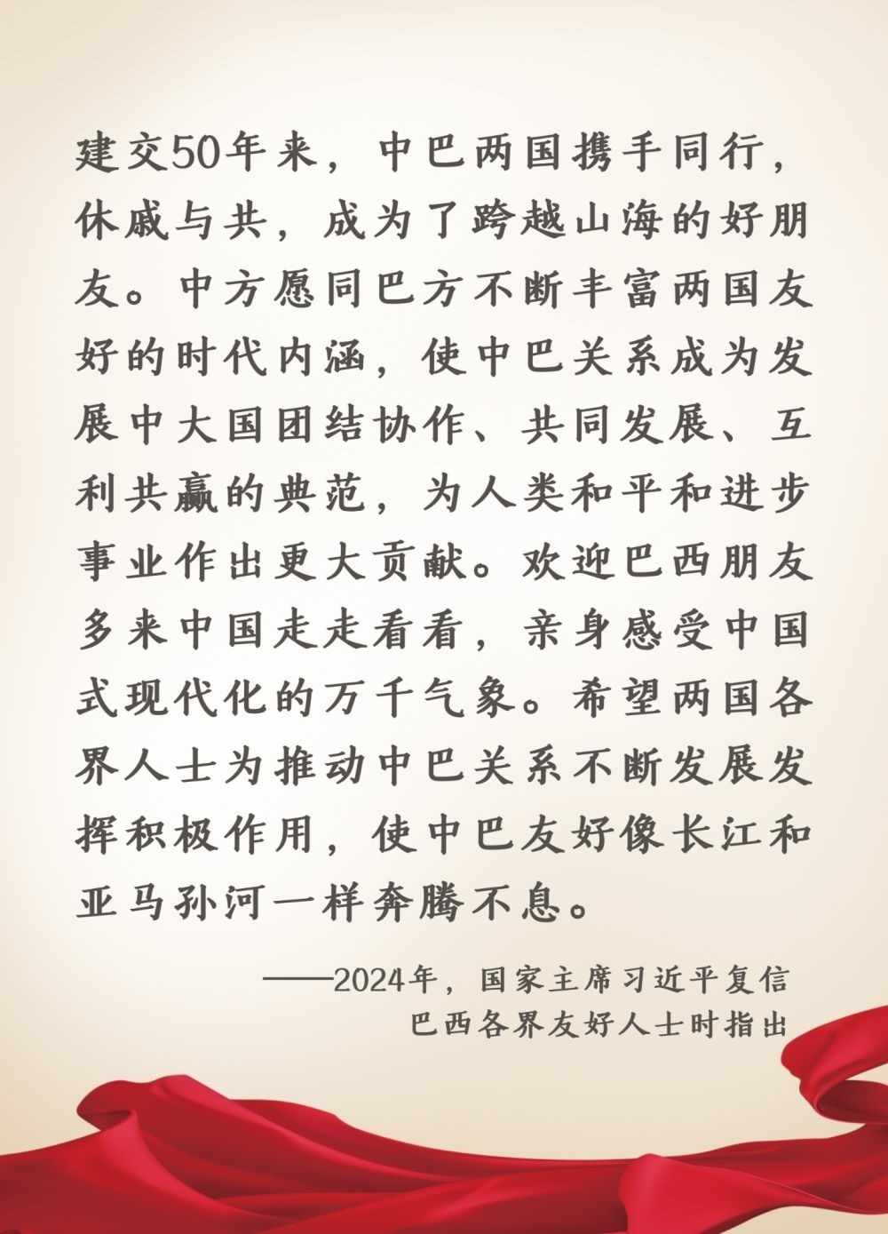 2023年4月,習(xí)近平主席同來(lái)華進(jìn)行國(guó)事訪(fǎng)問(wèn)的巴西總統(tǒng)盧拉舉行會(huì)談時(shí),談到雙方要以2024年慶祝建交50周年為契機(jī),繼續(xù)推動(dòng)中巴友好。