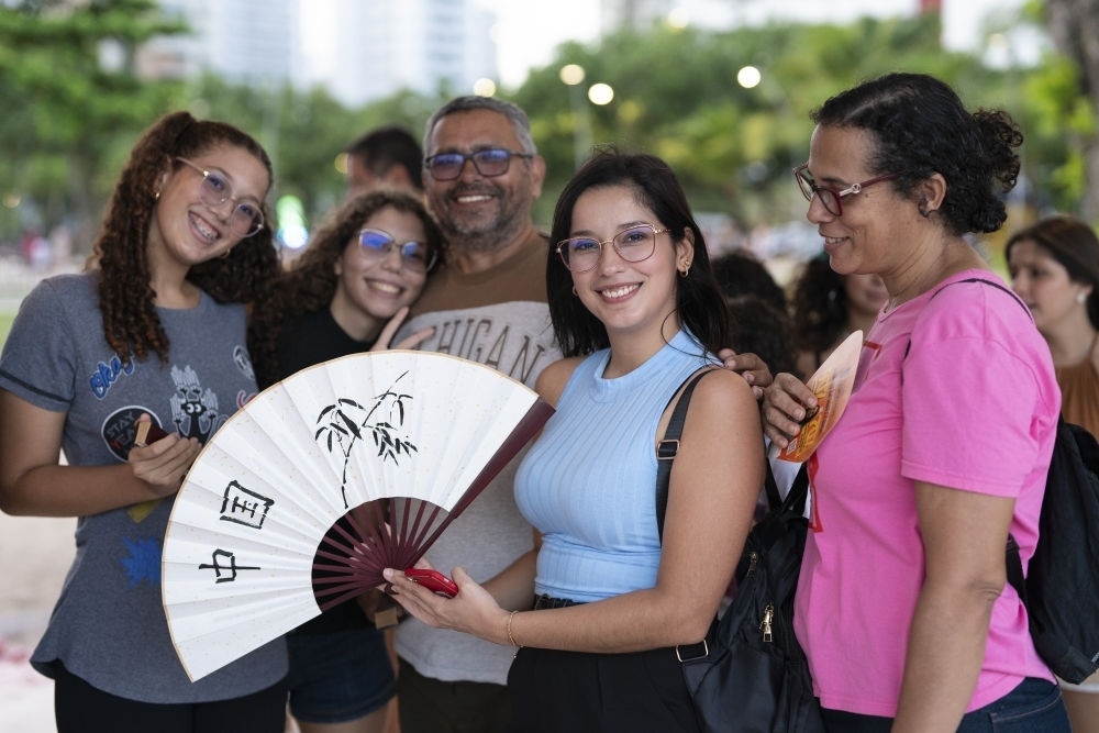 2024年2月3日,一名女子在巴西累西腓舉行的中國(guó)春節(jié)慶祝活動(dòng)上展示自己書(shū)寫(xiě)的扇面。