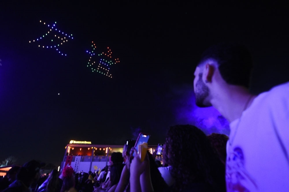 2024年8月17日,在巴西首都巴西利亞,人們?cè)谏碁┧囆g(shù)節(jié)中國(guó)日活動(dòng)上觀(guān)看無(wú)人機(jī)表演。