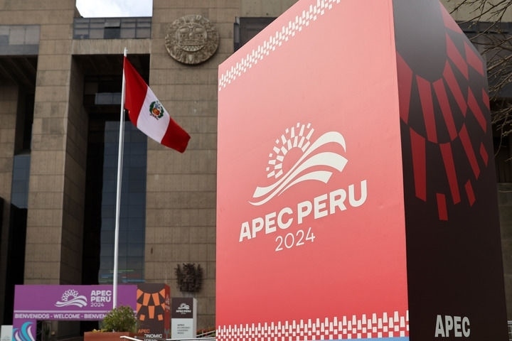 這是2024年11月10日在秘魯首都利馬拍攝的2024年亞太經(jīng)合組織會(huì)議標(biāo)識(shí)。新華社記者 李木子 攝