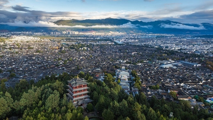 2024年11月8日,麗江古城日落風(fēng)光(無(wú)人機(jī)照片)。新華社記者 胡超 攝