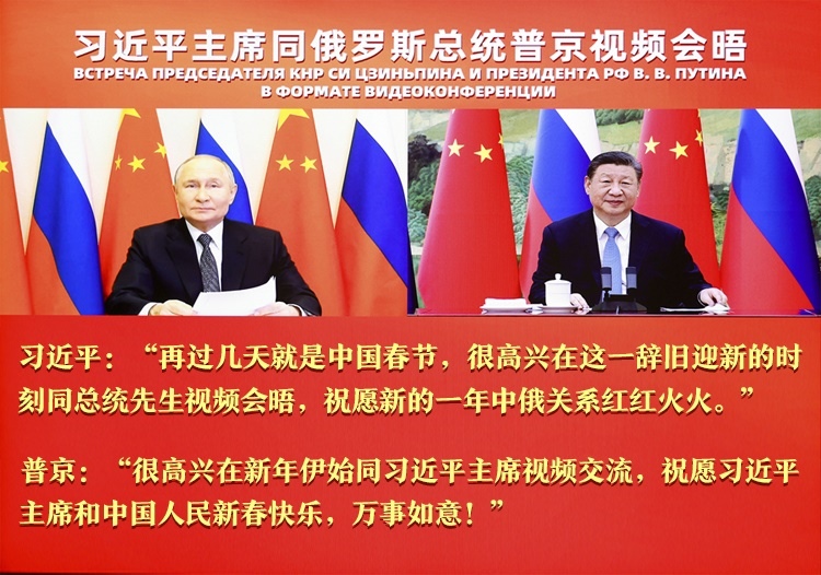 1月21日,中國國家主席習近平在北京同俄羅斯總統(tǒng)普京舉行視頻會晤,兩國元首互致新年祝福。習近平強調,新的一年,我愿同總統(tǒng)先生一道,繼續(xù)引領中俄關系登高望遠,以中俄關系的穩(wěn)定性和堅韌性應對外部環(huán)境的不確定性,共同促進兩國發(fā)展振興,維護國際公平正義。