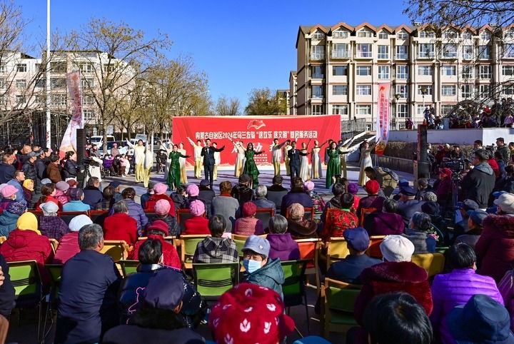 2024年11月21日,在內(nèi)蒙古伊金霍洛旗阿勒騰席熱鎮(zhèn),烏蘭牧騎隊員表演歌舞節(jié)目。新華社發(fā)(王正攝)