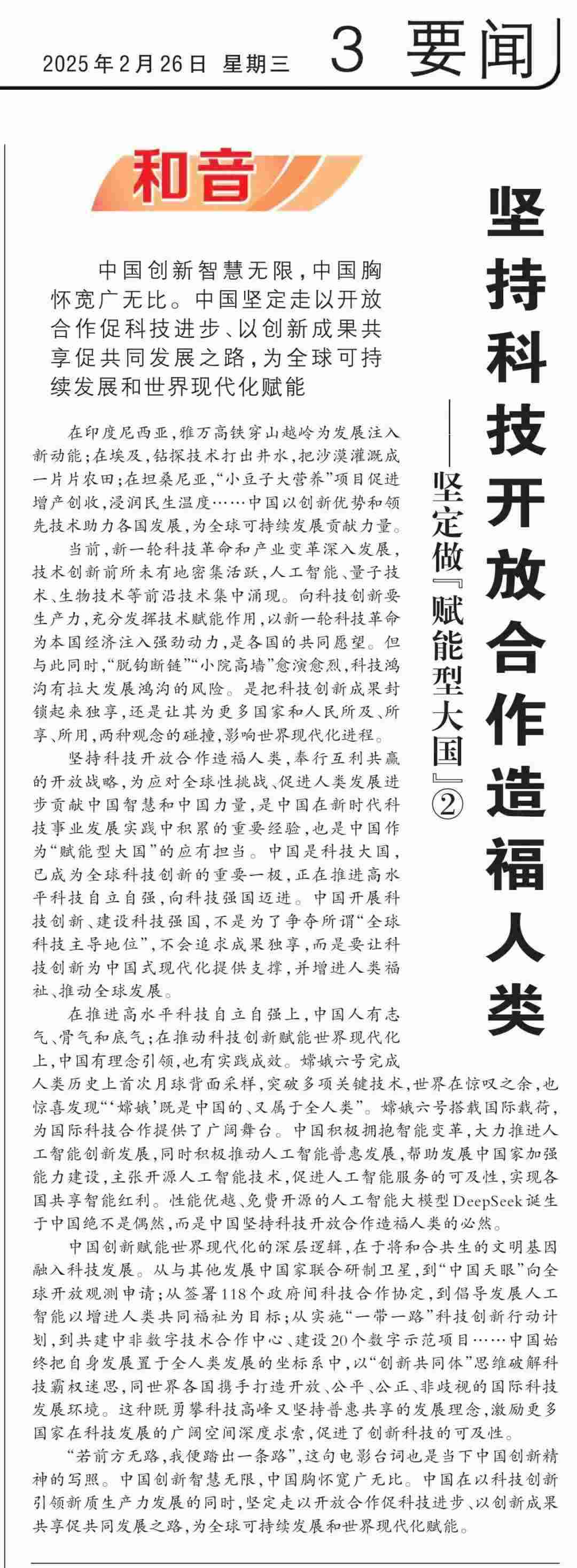 近期,《人民日報》“和音”欄目推出“堅定做‘賦能型大國’”系列評論,圍繞科技創(chuàng)新、開放共贏、綠色轉(zhuǎn)型、高質(zhì)量共建“一帶一路”、多邊治理等熱點議題,從不同角度闡釋中國何以成為一個“賦能型大國”的深層邏輯,展現(xiàn)中國始終秉持構(gòu)建人類命運(yùn)共同體理念,不斷以中國式現(xiàn)代化為世界現(xiàn)代化賦能的大國擔(dān)當(dāng)。