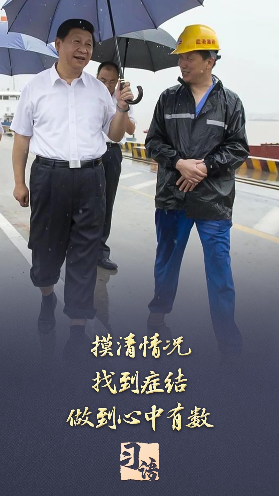 2013年7月,習(xí)近平總書記冒雨來(lái)到湖北武漢新港陽(yáng)邏集裝箱港區(qū)考察,他卷起褲腿,打著雨傘,蹚著積水邊走邊看邊問(wèn)。兩天后,在武漢主持召開部分省市負(fù)責(zé)人座談會(huì)時(shí),習(xí)近平總書記強(qiáng)調(diào):“研究、思考、確定全面深化改革的思路和重大舉措,刻舟求劍不行,閉門造車不行,異想天開更不行,必須進(jìn)行全面深入的調(diào)查研究。”