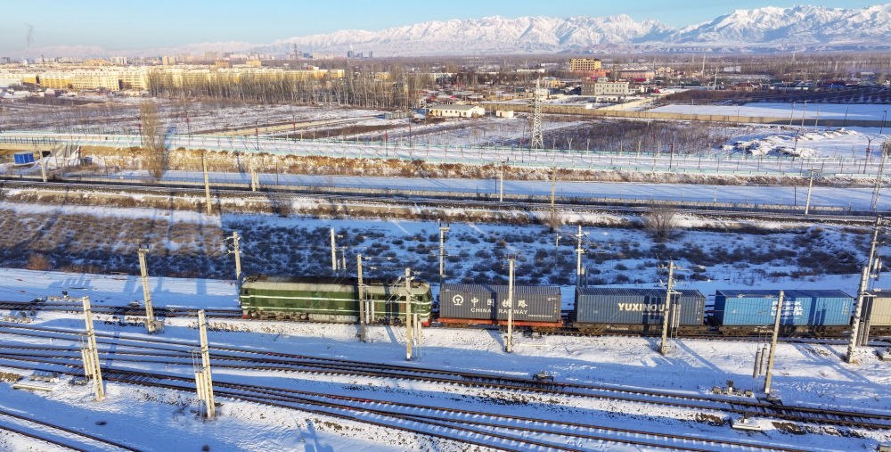 2024年12月25日,一列中歐班列經(jīng)霍爾果斯口岸駛向哈薩克斯坦(無人機(jī)照片)。霍爾果斯口岸地處伊犁哈薩克自治州、毗鄰哈薩克斯坦,是古絲綢之路北道上的千年驛站,也是近現(xiàn)代對外開放的百年口岸,更是我國面向中亞、西亞乃至歐洲的重要物流通道。2024年,該口岸中歐(中亞)班列開行量達(dá)8730列,同比增長12.5%;貨物過貨量達(dá)1208.4萬噸,同比增長10.9%;通行班列線路總數(shù)超過80條,輻射境外18個國家的46個城市。