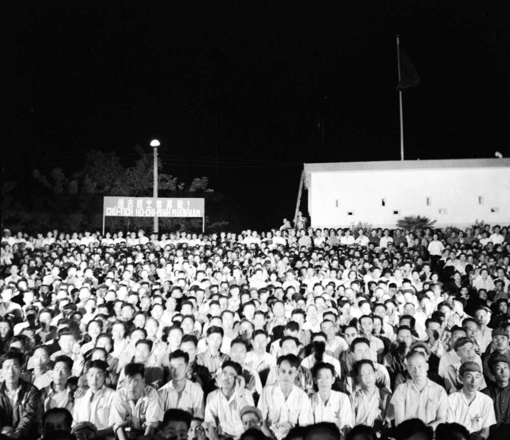 1959年12月,來自越南的客人在兩國(guó)邊境居民慶祝共建水利工程完工聯(lián)歡會(huì)上觀看演出。