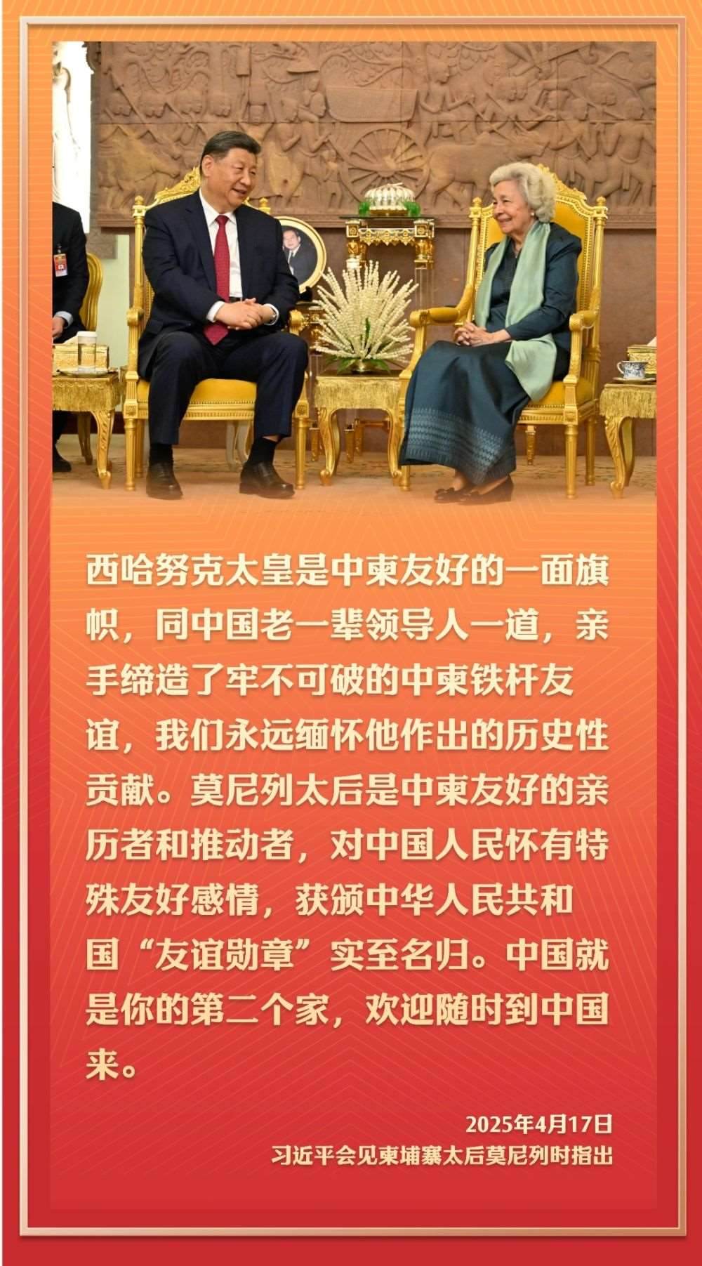 2016年10月13日,國家主席習(xí)近平在金邊看望柬埔寨太后莫尼列。莫尼列太后特意請習(xí)近平在西哈努克太皇生前常坐的椅子上就座。