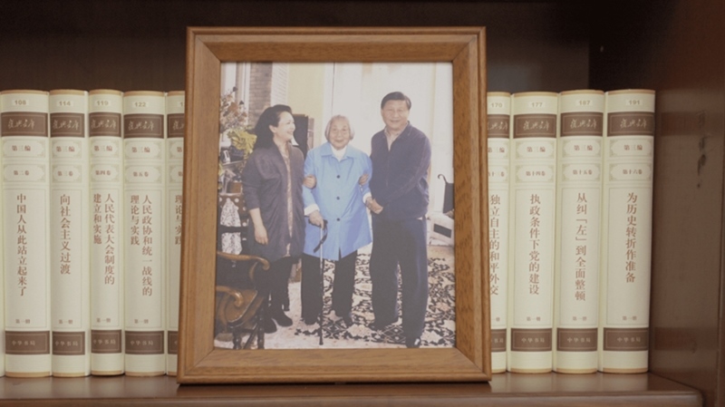 △ 習近平辦公室的書架上放著一張照片,照片中他和愛人彭麗媛攙扶著母親。