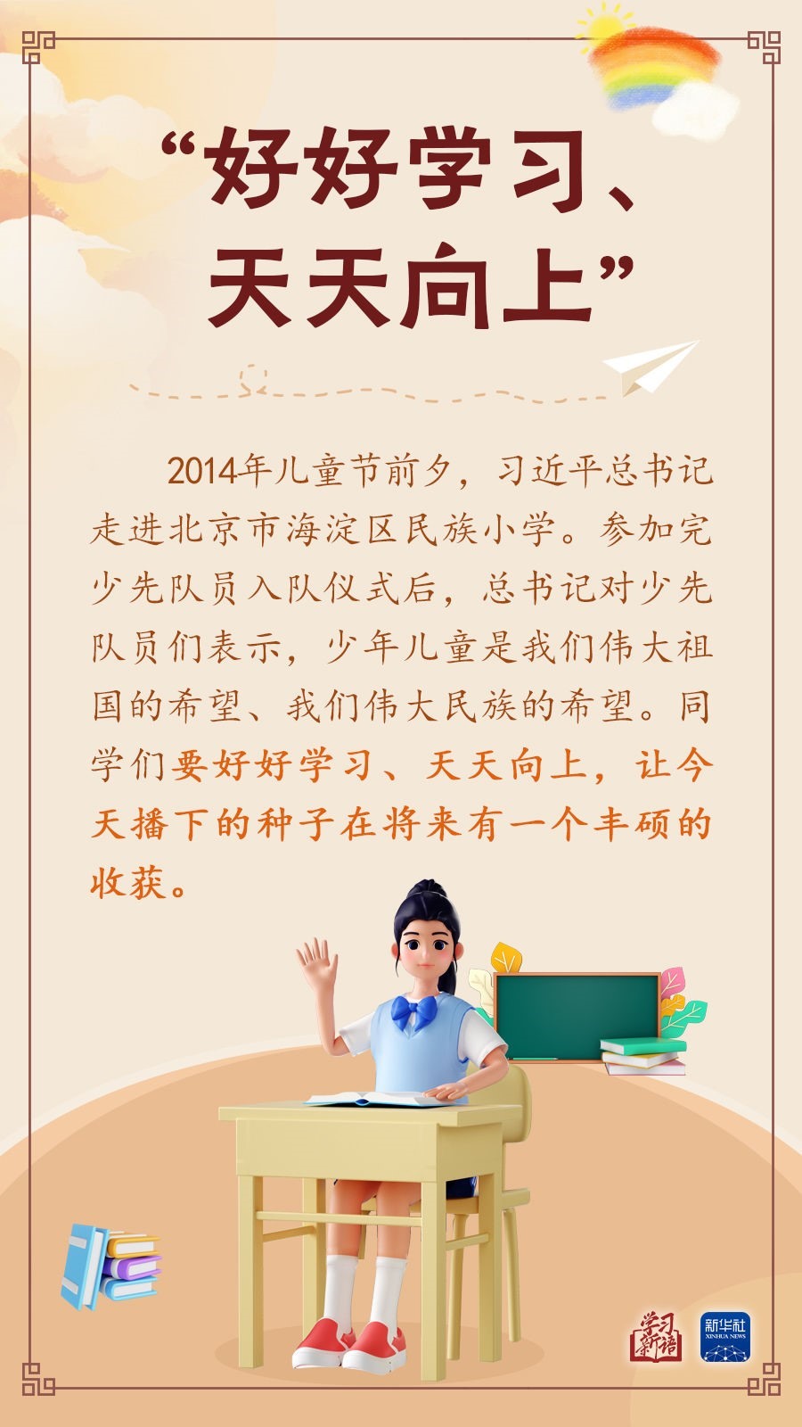 讓孩子們成長得更好,習(xí)近平總書記始終牽掛于心。本期“學(xué)習(xí)新語”,我們擷取總書記關(guān)心少年兒童健康成長的一些場景,感悟總書記對(duì)“祖國花朵”的真摯關(guān)懷和殷切期望。
