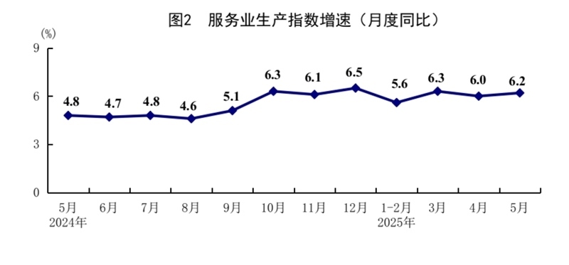 5月份,全國服務業(yè)生產(chǎn)指數(shù)同比增長6.2%,比上月加快0.2個百分點。分行業(yè)看,信息傳輸、軟件和信息技術服務業(yè),租賃和商務服務業(yè),批發(fā)和零售業(yè)生產(chǎn)指數(shù)同比分別增長11.2%、8.9%、8.4%,分別快于服務業(yè)生產(chǎn)指數(shù)5.0、2.7、2.2個百分點。1—5月份,全國服務業(yè)生產(chǎn)指數(shù)同比增長5.9%。1—4月份,規(guī)模以上服務業(yè)企業(yè)營業(yè)收入同比增長7.2%。5月份,服務業(yè)商務活動指數(shù)為50.2%,比上月上升0.1個百分點;服務業(yè)業(yè)務活動預期指數(shù)為56.5%,上升0.1個百分點。其中,鐵路運輸、航空運輸、郵政、電信廣播電視及衛(wèi)星傳輸服務、互聯(lián)網(wǎng)軟件及信息技術服務等行業(yè)商務活動指數(shù)位于55.0%以上較高景氣區(qū)間。