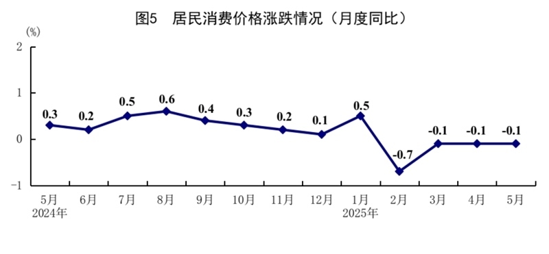 5月份,全國居民消費價格(CPI)同比下降0.1%,環(huán)比下降0.2%。分類別看,食品煙酒價格同比上漲0.1%,衣著價格上漲1.5%,居住價格上漲0.1%,生活用品及服務價格上漲0.1%,交通通信價格下降4.3%,教育文化娛樂價格上漲0.9%,醫(yī)療保健價格上漲0.3%,其他用品及服務價格上漲7.3%。在食品煙酒價格中,鮮菜價格下降8.3%,糧食價格下降1.4%,豬肉價格上漲3.1%,鮮果價格上漲5.5%??鄢称泛湍茉磧r格后的核心CPI同比上漲0.6%,漲幅比上月擴大0.1個百分點。1—5月份,全國居民消費價格同比下降0.1%。
