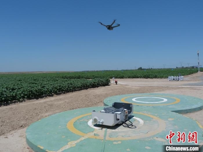 6月28日,新疆石河子市一片棉田中,遙感監(jiān)測(cè)作物長(zhǎng)勢(shì)的無(wú)人機(jī)巡檢返回。 趙婧姝 攝