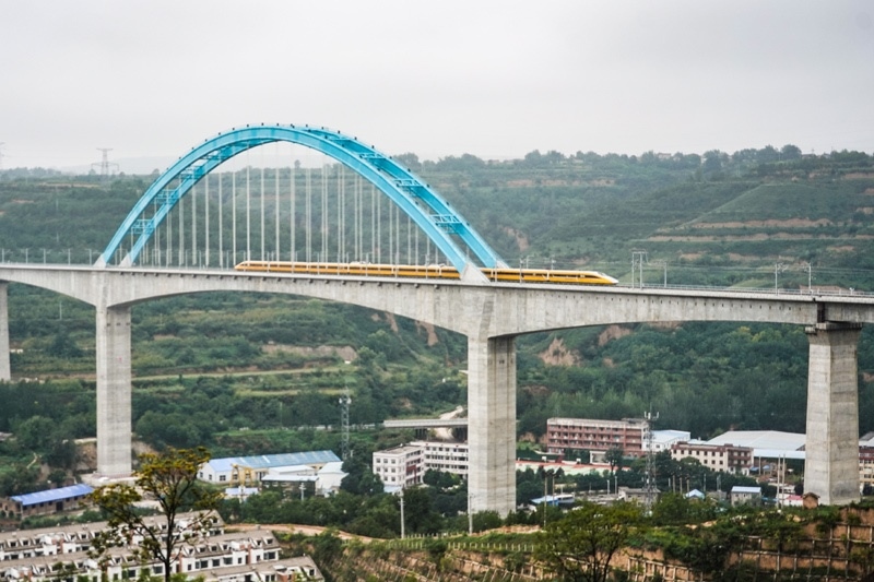9月11日,聯(lián)調(diào)聯(lián)試綜合檢測(cè)列車駛過(guò)位于陜西省銅川市的西延高鐵王家河特大橋。