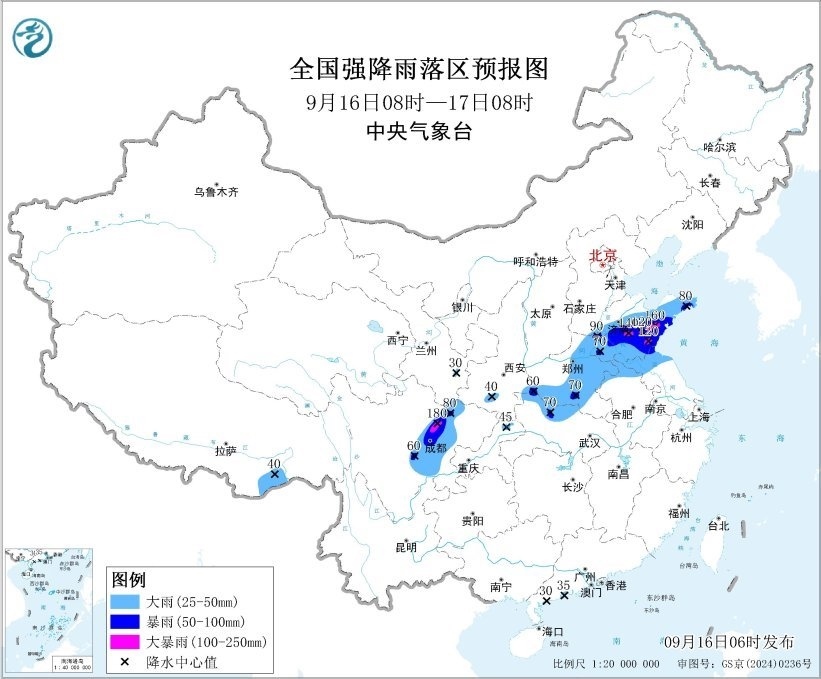 預(yù)計(jì),9月16日8時(shí)至17日8時(shí),四川盆地中西部、甘肅南部、河南中東部、山東中南部以及蘇皖北部等地部分地區(qū)有大到暴雨,其中,山東中南部、四川盆地北部等地部分地區(qū)有大暴雨(100~180毫米)。上述部分地區(qū)伴有短時(shí)強(qiáng)降水(最大小時(shí)降雨量20~50毫米,局地可超過(guò)70毫米),局地有雷暴大風(fēng)等強(qiáng)對(duì)流天氣。