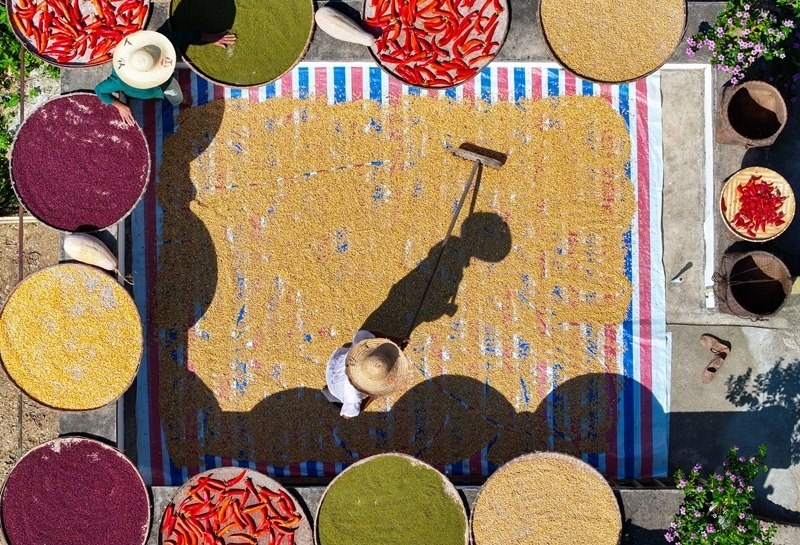秋收時(shí)節(jié),在安徽省黃山市歙縣深渡鎮(zhèn)陽(yáng)產(chǎn)村,村民利用晴好天氣,抓緊晾曬收獲的辣椒、玉米、山核桃等農(nóng)作物,描繪出一幅山村“曬秋”圖。