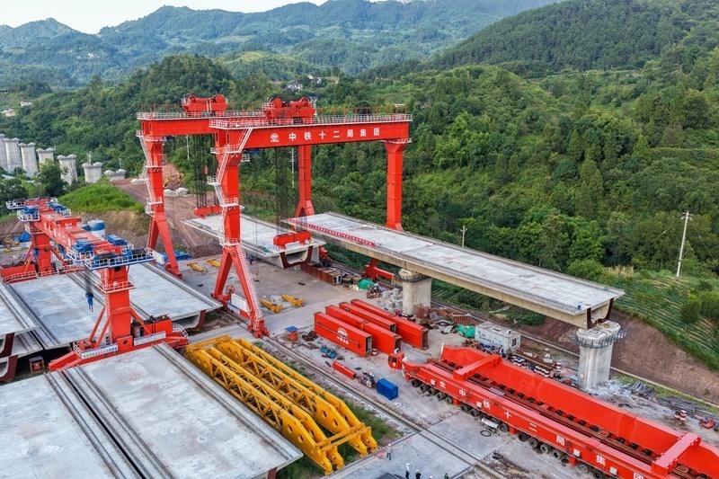 當(dāng)日,由中鐵十二局集團(tuán)承建的渝萬高鐵江林村特大橋進(jìn)入架梁施工作業(yè)階段。渝萬高鐵是我國“八縱八橫”高鐵網(wǎng)包(銀)海、京昆通道的組成部分,正線全長251公里,設(shè)計時速350公里。