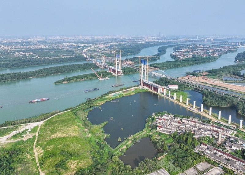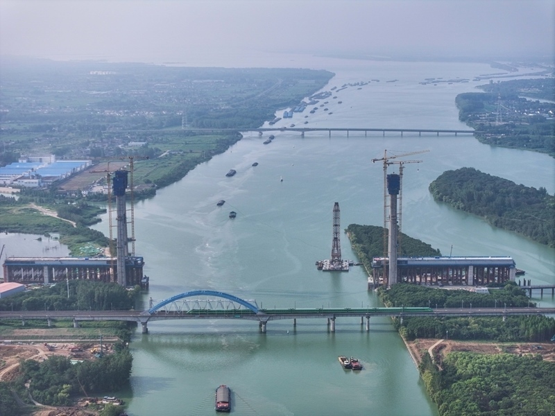 這是滬渝蓉高鐵跨京杭運(yùn)河斜拉橋施工現(xiàn)場(chǎng)(7月13日攝,無(wú)人機(jī)照片)。
