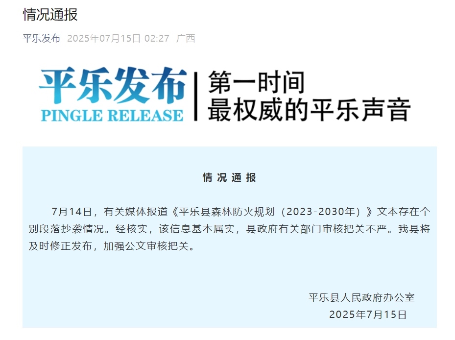 7月14日,有關(guān)媒體報(bào)道《平樂(lè)縣森林防火規(guī)劃(2023-2030年)》文本存在個(gè)別段落抄襲情況。經(jīng)核實(shí),該信息基本屬實(shí),縣政府有關(guān)部門(mén)審核把關(guān)不嚴(yán)。我縣將及時(shí)修正發(fā)布,加強(qiáng)公文審核把關(guān)。