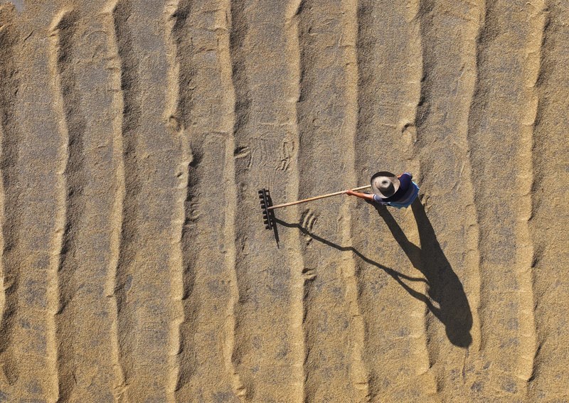 7月15日,在湖南省衡陽市衡山縣福田鋪鄉(xiāng),村民在翻曬稻谷(無人機(jī)照片)。