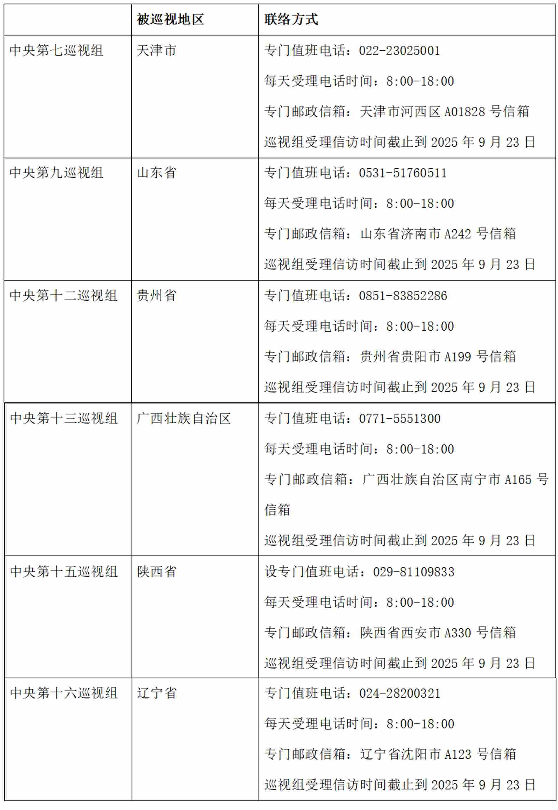 根據(jù)黨中央關(guān)于巡視工作的統(tǒng)一部署,近日,二十屆中央第六輪巡視的16個巡視組陸續(xù)開始進駐被巡視地區(qū),并公布了聯(lián)系方式。