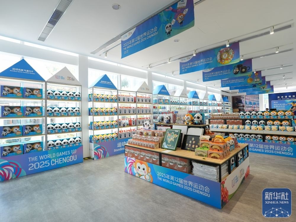 ↑ 這是8月3日在成都世運會運動員村A區(qū)拍攝的官方特許商品零售店內(nèi)的紀(jì)念品。新華社記者 王曦 攝