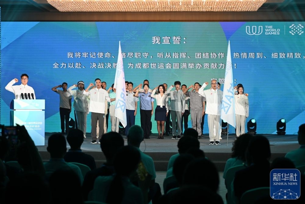 ↑ 在成都世運會運動員村開村活動上,工作人員代表集體宣誓。新華社記者 胥冰潔 攝