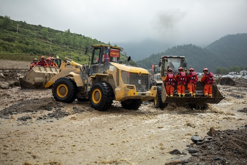 8月9日,國家西北區(qū)域應(yīng)急救援中心指戰(zhàn)員在馬坡鄉(xiāng)舊莊溝村依托大型機(jī)械渡河開展搜救工作。