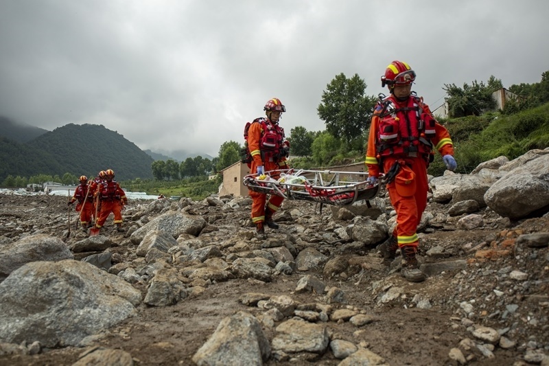 8月9日,國家西北區(qū)域應(yīng)急救援中心指戰(zhàn)員在馬坡鄉(xiāng)舊莊溝村攜帶救援擔(dān)架沿河道搜救失聯(lián)人員。
