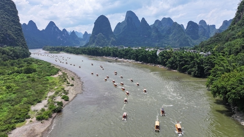 8月10日,在漓江廣西桂林市陽朔縣興坪鎮(zhèn)段,游客乘竹筏游玩賞景(無人機照片)。