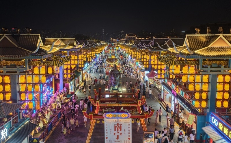 8月9日,在廣西南寧市“南寧之夜”街區(qū),游客逛夜市(無人機照片)。