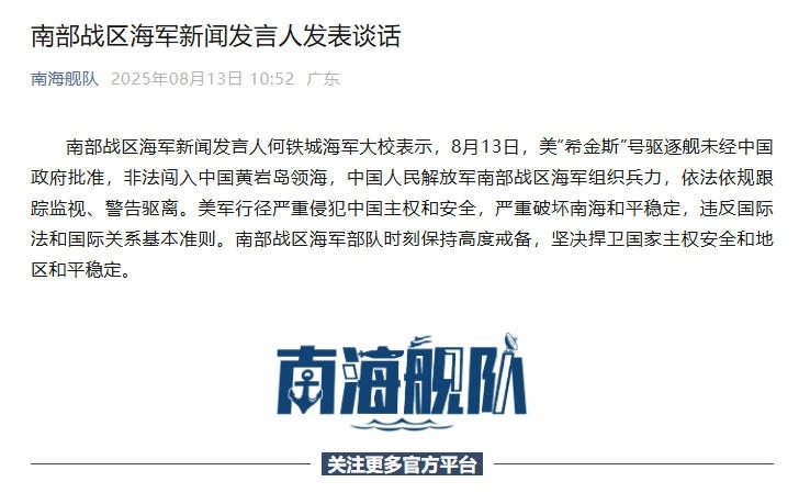 中國網(wǎng)8月13日訊 據(jù)“南海艦隊(duì)”微信公眾號(hào)消息,南部戰(zhàn)區(qū)海軍新聞發(fā)言人何鐵城海軍大校表示,8月13日,美“希金斯”號(hào)驅(qū)逐艦未經(jīng)中國政府批準(zhǔn),非法闖入中國黃巖島領(lǐng)海,中國人民解放軍南部戰(zhàn)區(qū)海軍組織兵力,依法依規(guī)跟蹤監(jiān)視、警告驅(qū)離。美軍行徑嚴(yán)重侵犯中國主權(quán)和安全,嚴(yán)重破壞南海和平穩(wěn)定,違反國際法和國際關(guān)系基本準(zhǔn)則。南部戰(zhàn)區(qū)海軍部隊(duì)時(shí)刻保持高度戒備,堅(jiān)決捍衛(wèi)國家主權(quán)安全和地區(qū)和平穩(wěn)定。
