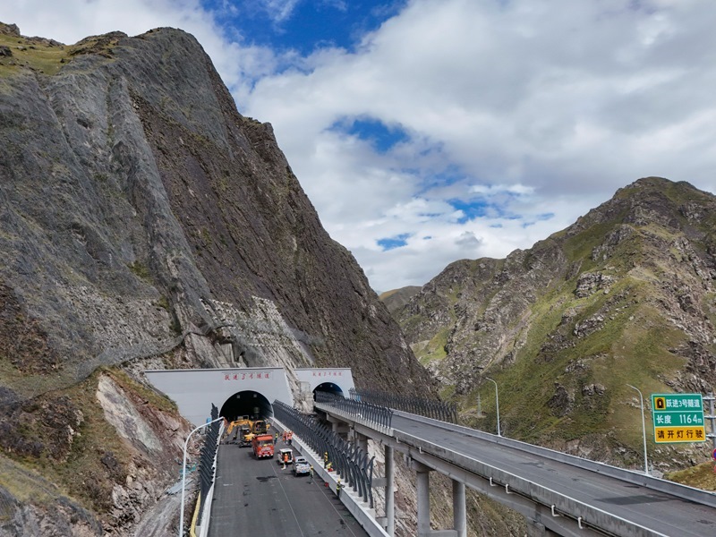 工人在新疆烏尉高速公路躍進(jìn)3號(hào)隧道南端施工(8月19日攝,無人機(jī)照片)。