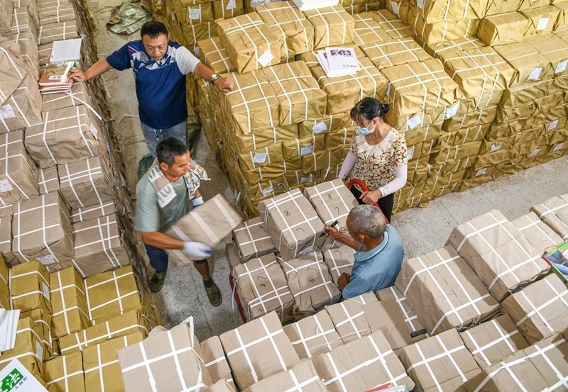 8月25日,在湖南省永州市道縣新華書店倉庫,工作人員在搬運(yùn)新學(xué)期教材。