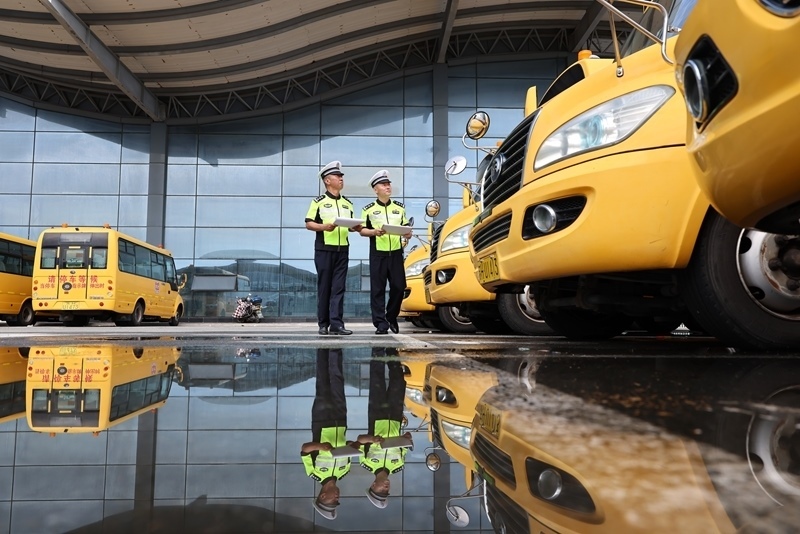 8月25日,湖北省襄陽市??悼h公安局交警大隊(duì)民警對(duì)校車進(jìn)行安全檢查(無人機(jī)照片)。